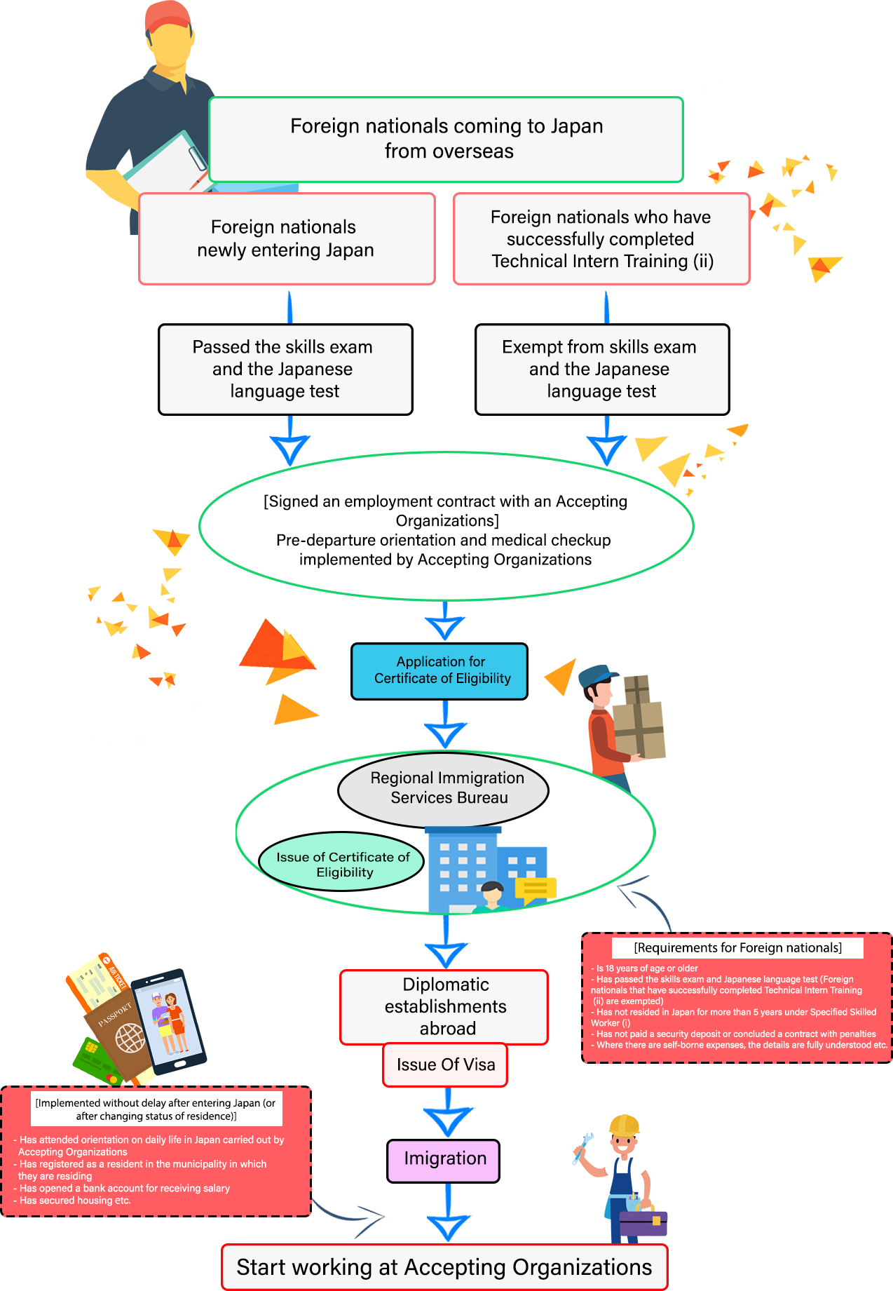 - Period of stay: Renewed annually, every 6 months or every 4 months, for a maximum stay of up to 5 years in total - Skill Standards: Confi rmed by exams, etc. (those who have successfully completed Technical Intern Training (ii) are exempt from exams, etc.) - Japanese Language Level: Profi ciency in Japanese language required in daily life and at workplace need to be confi rmed by exams, etc. (those who have successfully completed Technical Intern Training (ii) are exempt from exams, etc.) - Accompanied by family members: Basically not permitted. - Eligible for Support by Accepting Organizations or Registered Support Organizations |